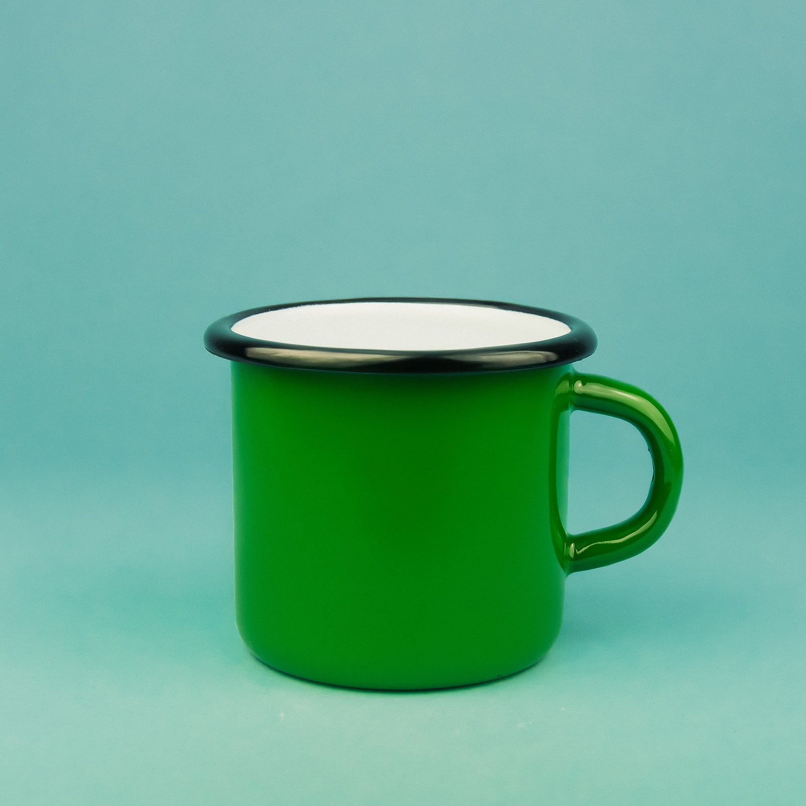 Bottle green porcelain enamel mug with a durable yet lightweight design, perfect for camping or in the kitchen.