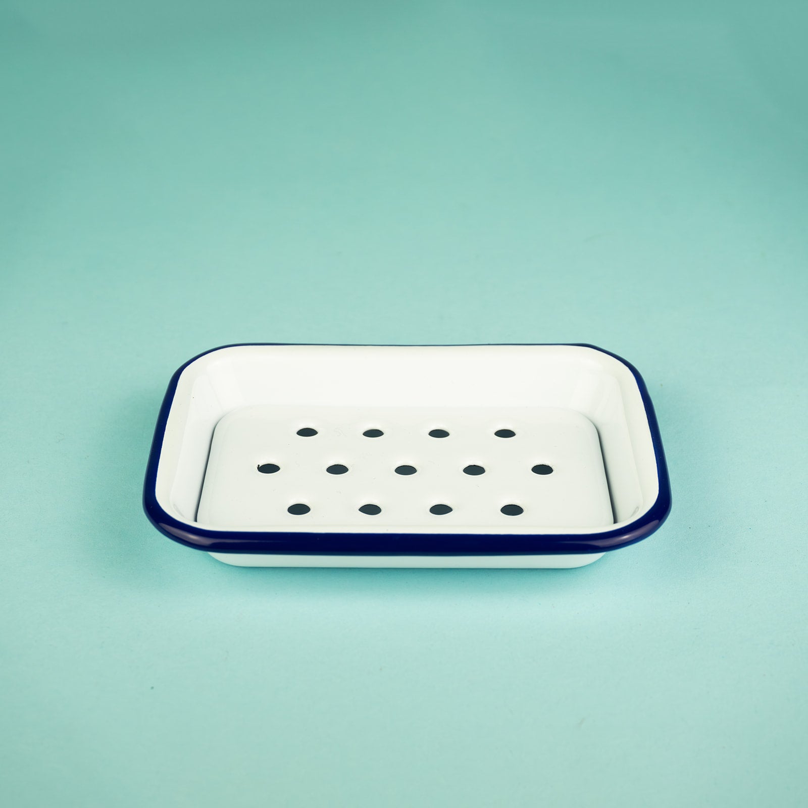 Classic enamel soap dish. Removable drainage tray for easy cleaning. Adds a vintage inspired touch to any bathroom and looks great paired with any of our soaps.
